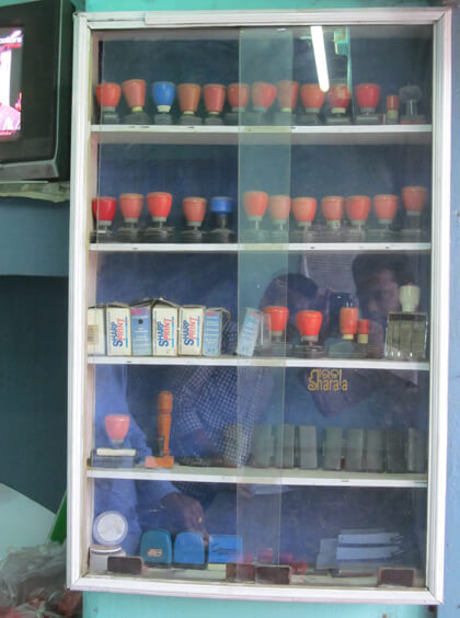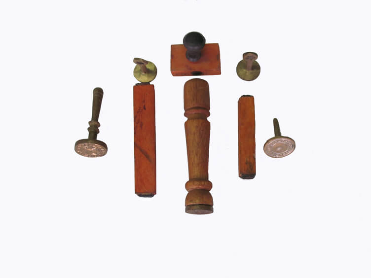 Rubber stamps and brass seals on display