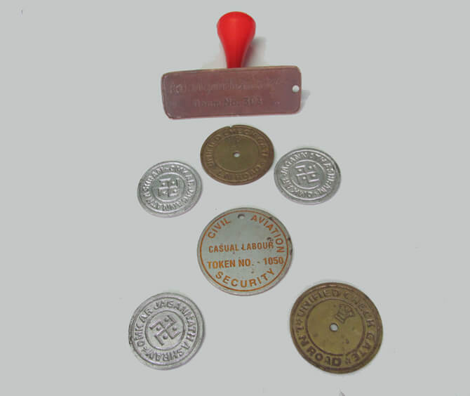 Silver and Brass tokens on display